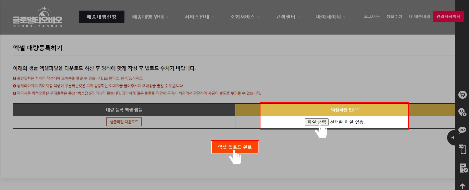 4. 우측 파일선택 버튼을 클릭하여 PC에 저장된 엑셀 파일을 업로드 해 주세요.